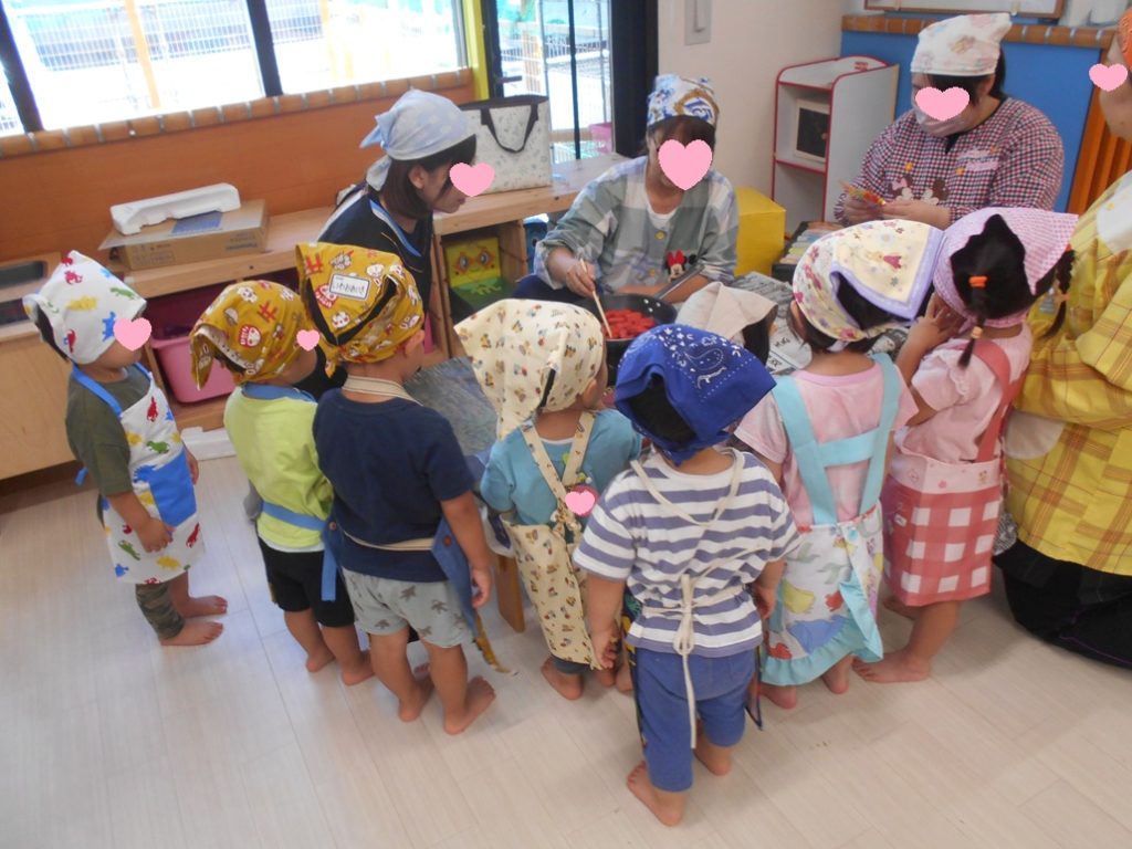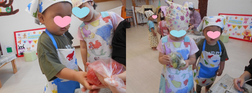 トマトをつぶす感触に最初は「うっ・・・」という表情でしたが慣れてくると何度もつぶしていました🍅
